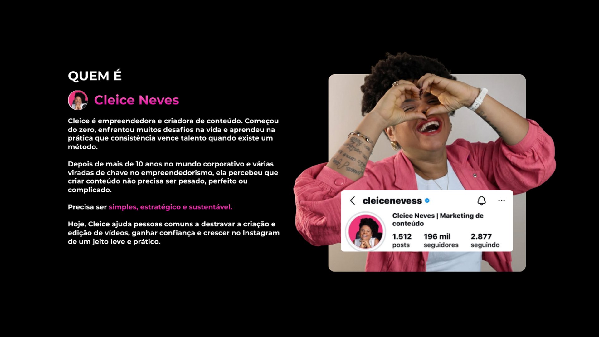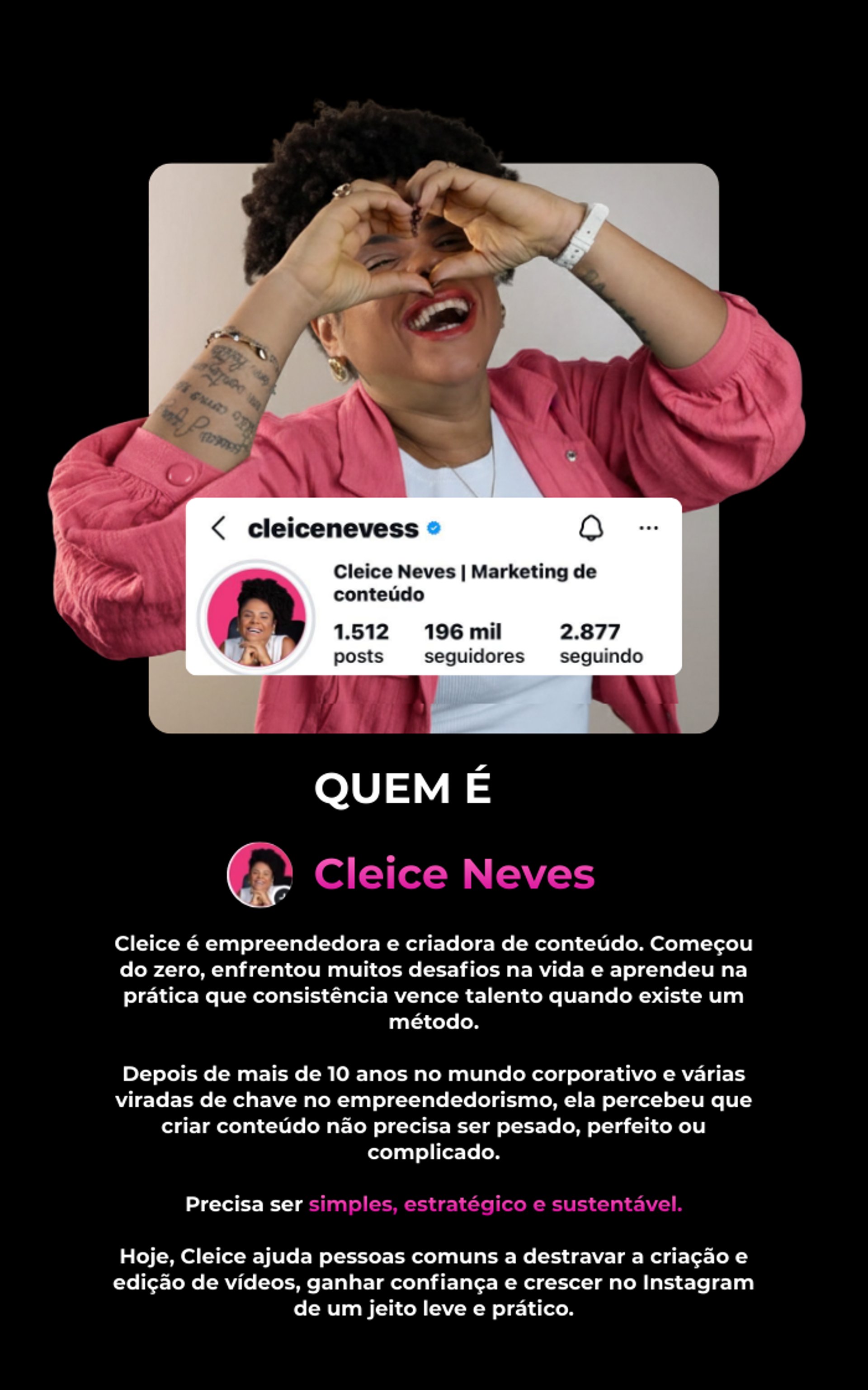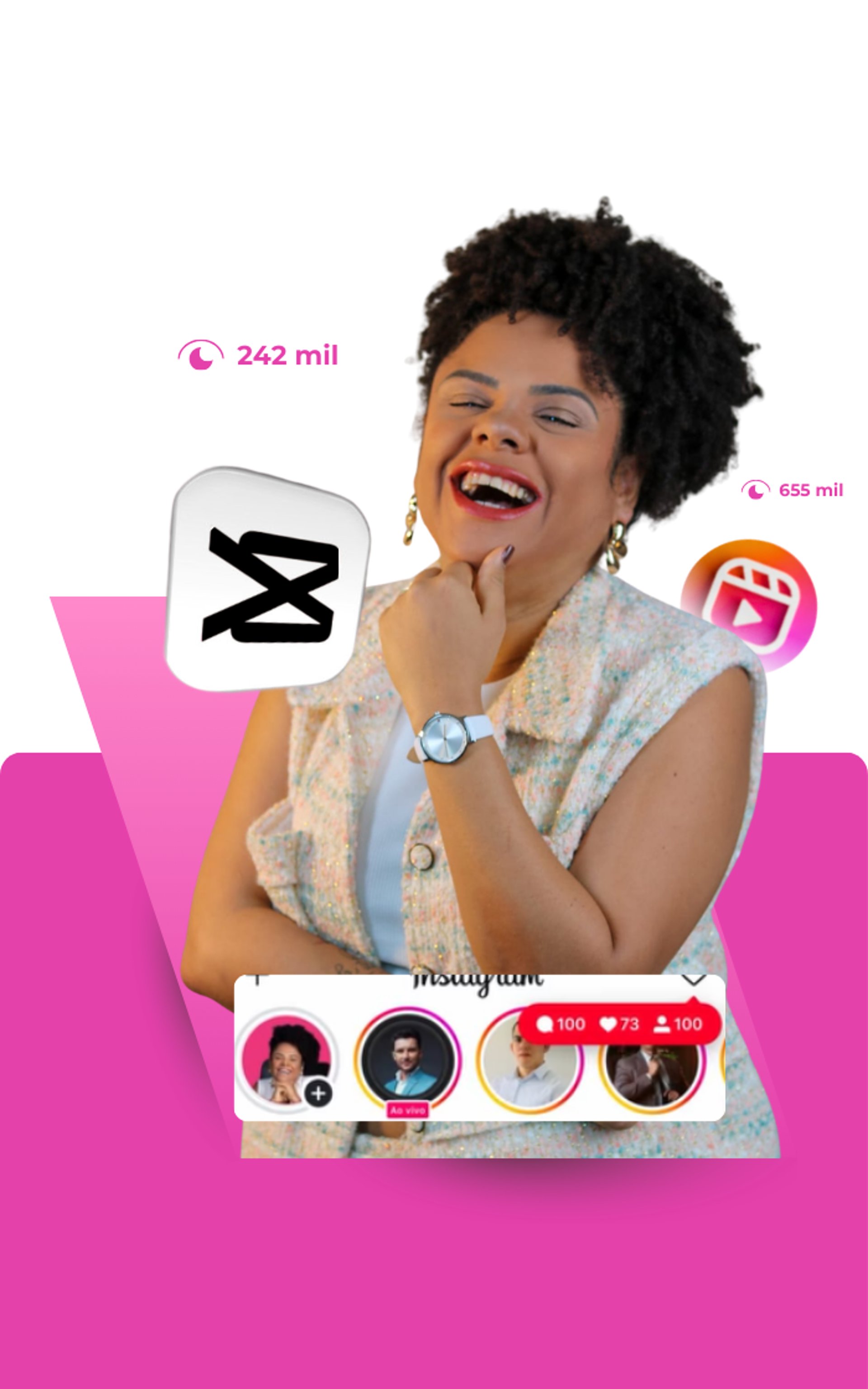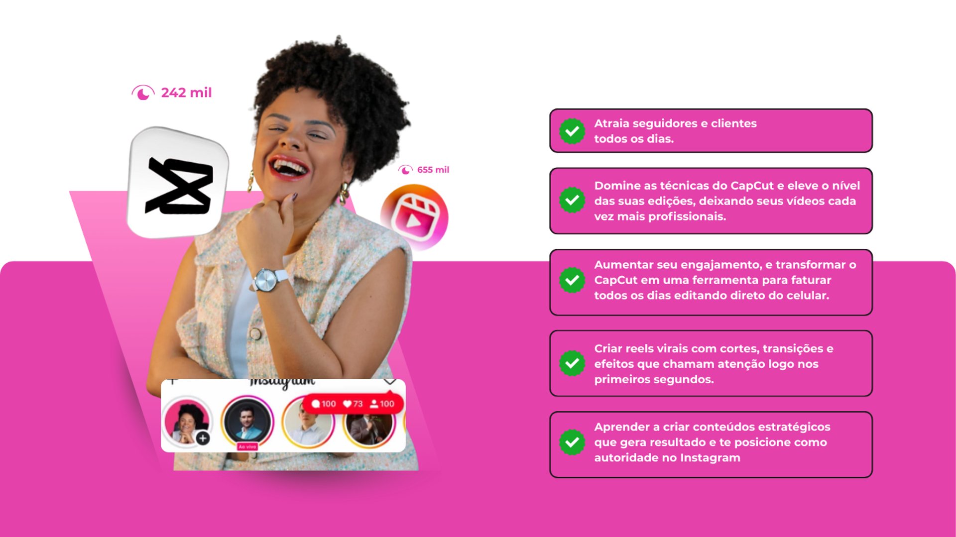 Depois de anos criando conteúdos e ajudando empreendedoras a crescer no Instagram, eu desenvolvi O CapCut Estratégico, um treinamento com um processo simples e descomplicado, criado para ensinar as estratégias por trás das edições, como roteiros, iluminação, equipamentos, configurações de câmera para acelerar ainda mais seus resultados.