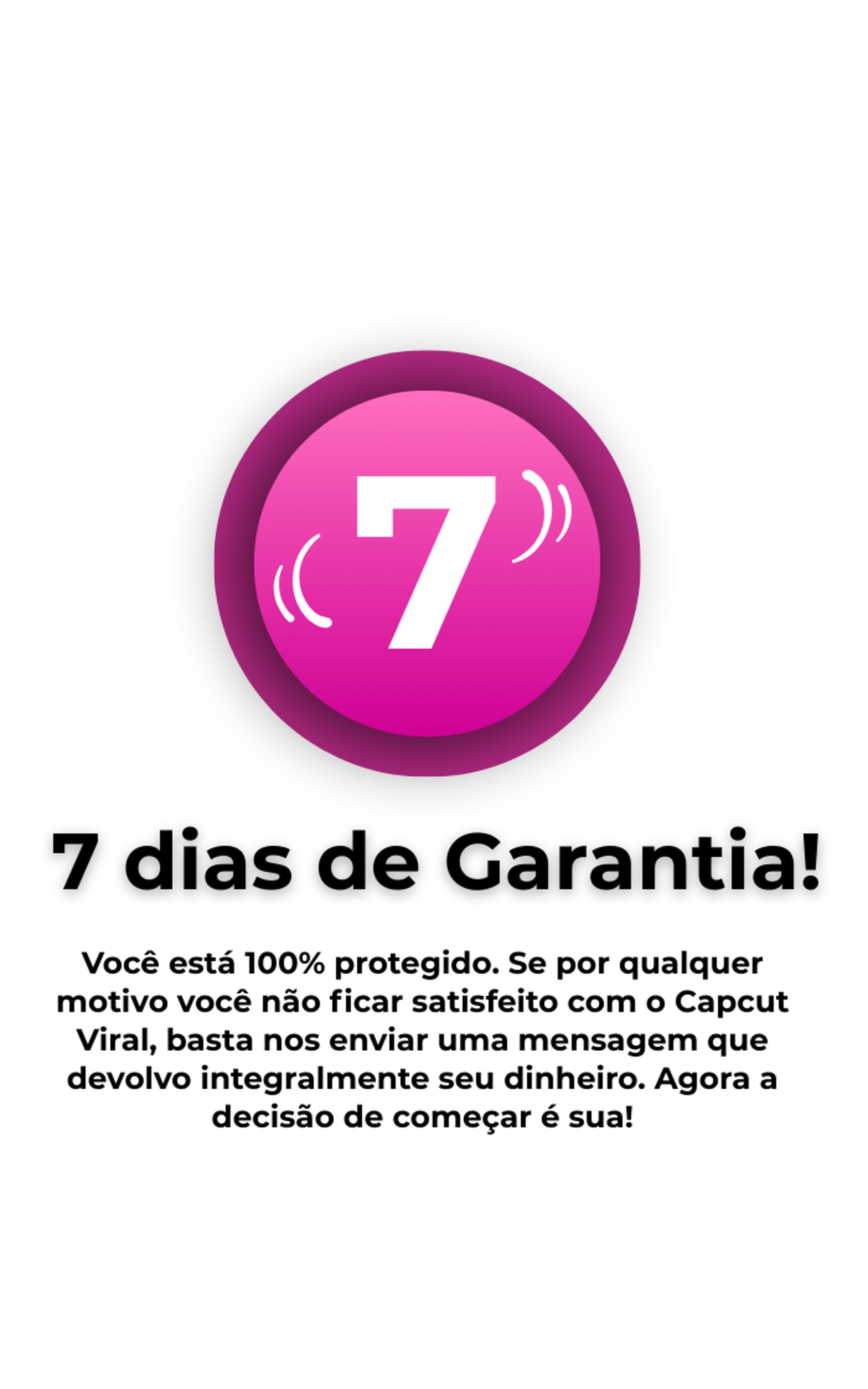 Você está 100% protegido. Se por qualquer motivo você não ficar satisfeito com o Capcut Viral, basta nos enviar uma mensagem que devolvo integralmente seu dinheiro. Agora a decisão de começar é sua!